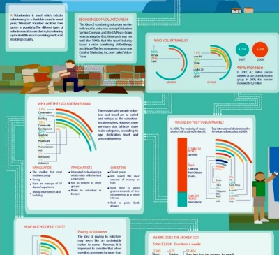 Men are also way behind in their altruism, with women beating them nearly 2 to 1. And, as the graphic’s note points out, the number of people taking such trips increased by 46% (from 4.7 million people to 6.2 million people) from 2007 to 2008, a good sign for this new travel trend. Now if only more organizations were in need of the skills of an experienced blogger to lend them a hand for a few weeks. . .